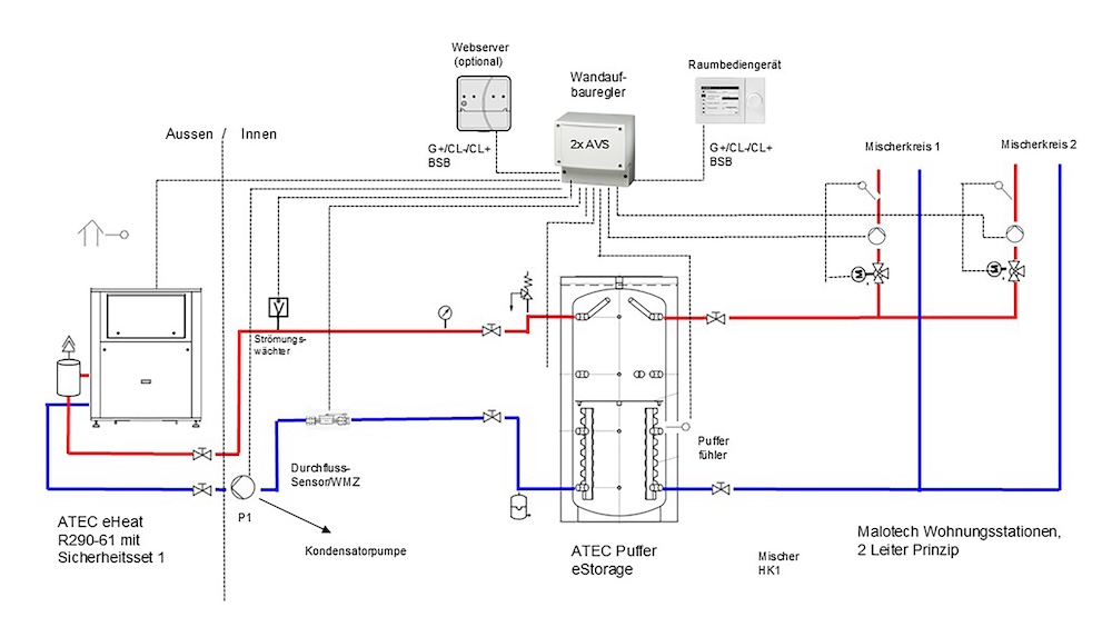 Für höchste Sicherheit sorgen gasdichte Kabelverschraubungen, außerdem ein hermetisch getrennter Maschinenraum inklusive Ölauffangwanne sowie R290-Detektoren mit Abschalt- und Warnfunktion. Mit Zubehör wie Gasabscheider, Sicherheitszwischenkreis, Umwälzpumpe oder Webserver lassen sich Anlagen fallgenau optimieren. ATEC unterstützt intensiv bei Planung, Installation und Wartung. Auf Anfrage erhalten Kunden schalltechnische Untersuchungen nach ISO 9612 oder passend konfigurierte Hydraulikkonzepte samt Materiallisten.