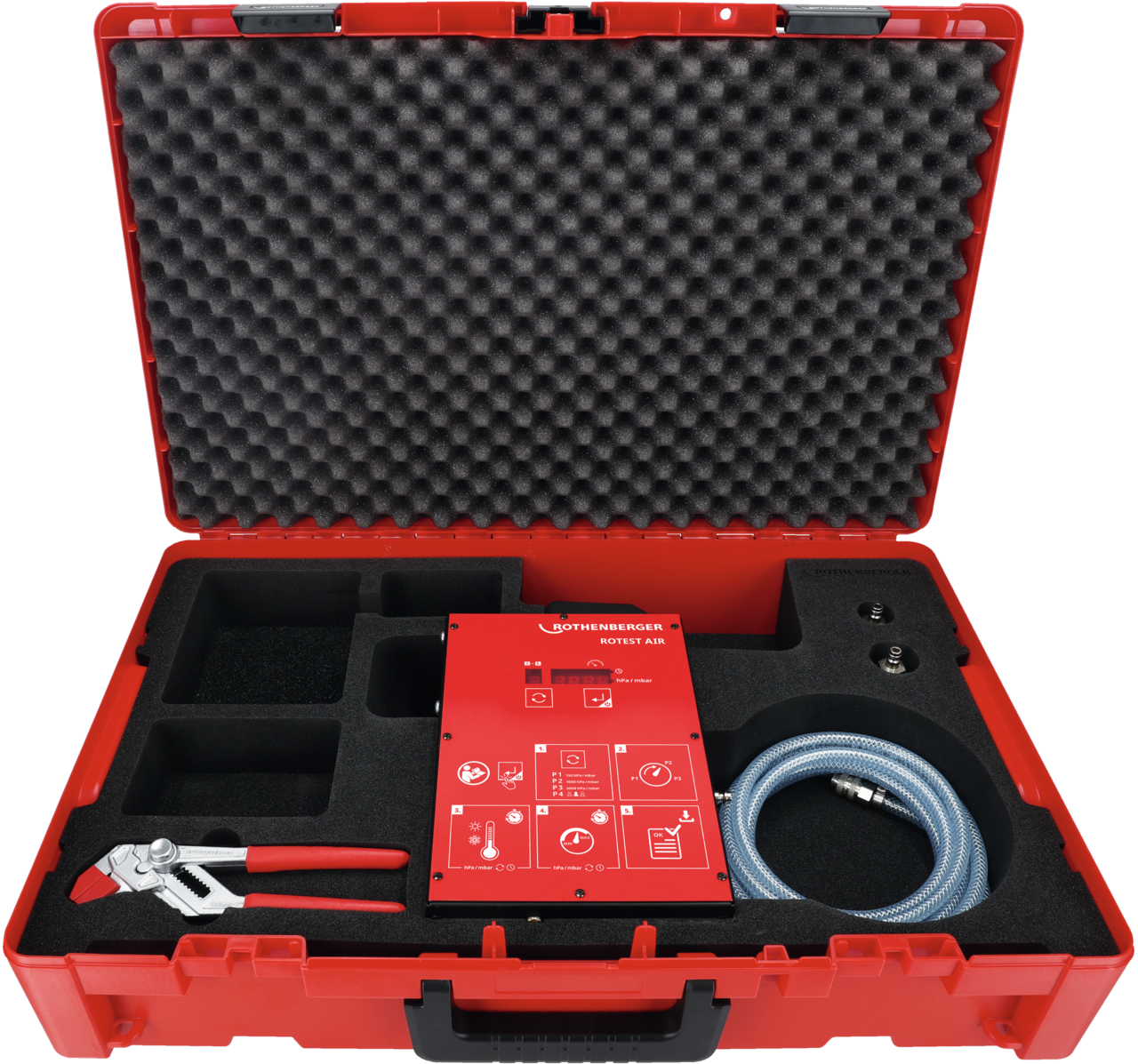 Das ROTEST AIR wird einfach an eine Einleitungsstelle bzw. einen Wasseranschluss angeschlossen. Auf dem Gerät können das Prüfprogramm intuitiv ausgewählt und Informationen während des Testvorgangs im Display abgelesen werden. Je nach Programmauswahl baut der integrierte Kompressor einen Luftdruck von bis zu 3 bar im Leitungssystem auf und regelt dabei automatisch die Prüfdrücke und Prüfzeiten. Ein ebenfalls integrierter Prüfcomputer gewährleistet im Falle der Dichtheit die normgerechte Aufrechterhaltung des Drucks für einen definierten Testzeitraum oder registriert Druckverluste bei Undichtigkeit. Letztere lassen sich per ROTEST Lecksuchspray schnell orten – auf die Verbindungsstellen gesprüht zeigt es undichte Stellen durch Blasenbildung an. Alle Tests werden aufgezeichnet und können problemlos über die ROTHENBERGER App ausgelesen werden. Der interne Gerätespeicher sichert zudem die letzten 100 Prüfungen. So ist das Gerät auch ohne App-Anbindung vollwertig nutzbar und die Dokumentation kann leicht im Nachgang erstellt werden. Dank der leistungsstarken CAS-Akkutechnologie ist das ROTEST AIR auf der Baustelle netzunabhängig und fügt sich nahtlos in den CAS-Werkzeugpark des Anwenders ein. Mit dem All-in-One Dichtheitsprüfgerät ROTEST AIR hat ROTHENBERGER ein durchdachtes System geschaffen, das zusammen mit dem für die Prüfung notwendigen Zubehör, bequem in einem robusten ROCASE-Koffer Platz findet. Eben All-in-One.