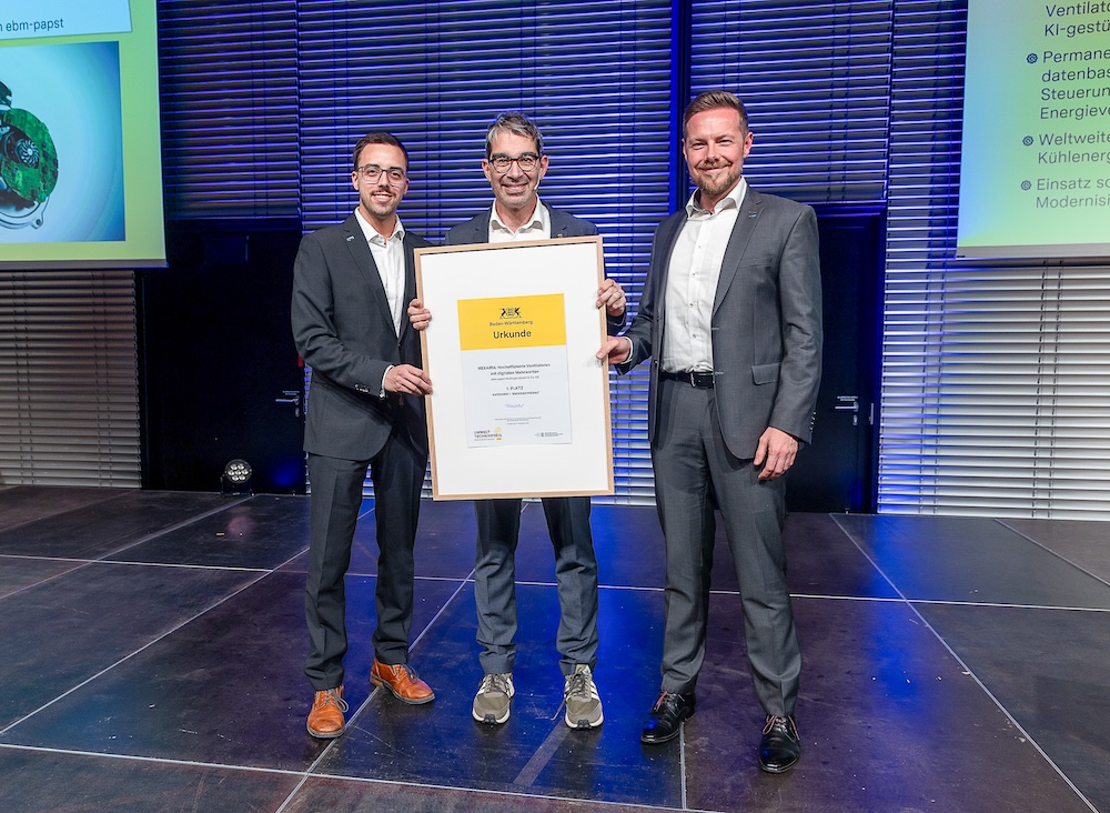 Die ebm-papst Gruppe zählt zu Baden-Württembergs Umwelttechnik-Innovationsführern. Mit seinen hocheffizienten Ventilatoren in Verbindung mit dem digitalen Ökosystem NEXAIRA konnte das Familienunternehmen aus Mulfingen die Jury des Umwelttechnikpreis Baden-Württemberg in der Kategorie „Energieeffizienz“ überzeugen.