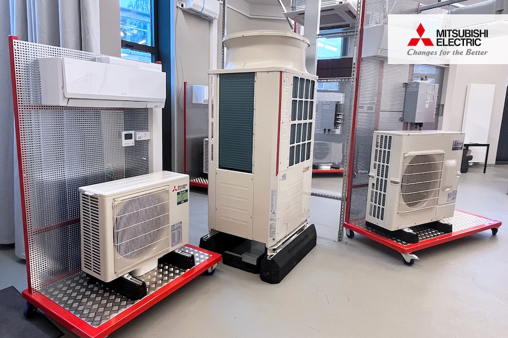 Für die Bereiche Raumklimatisierung und Systemintegration stehen verschiedene Split- und Multisplit-Systeme zur Verfügung. Dazu zählen kompakte Wandgeräte, Deckenkassetten und bodenstehende Truhengeräte, die sowohl für Wohn- als auch für Gewerbeanwendungen eingesetzt werden. Für eine praxisnahe Installation sind viele der Anlagen auf Rollwagen montiert, so dass Schulungsteilnehmende die Geräte aus nächster Nähe erleben, aufbauen, warten und testen können. Darüber hinaus demonstrieren größere Systeme aus der City Multi-Serie den Aufbau und die Funktionsweise von VRF-Anlagen. Diese leistungsstarken Systeme zeigen, wie sich mehrere Innengeräte intelligent steuern und in komplexe Gebäudestrukturen integrieren lassen. Ergänzend dazu stehen verschiedene Regelkomponenten und Bedieneinheiten bereit, mit denen sich Kommunikations- und Steuerungstechnologien einfach erlernen lassen. Damit bietet das Trainingszentrum optimale Voraussetzungen, um Fachpartner in den Bereichen Wärmepumpentechnik, Klimatisierung und Regelungssysteme praxisnah zu schulen und ihnen die neuesten Produktinnovationen von Mitsubishi Electric näherzubringen.